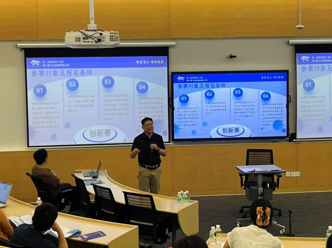 广东省博士博士后人才发展促进会郑厚明秘书长对本次创赛的赛事规则进行解读及报名培训。本次大湾区博士博士后创新创业大赛以“智荟湾心 博创未来”为主题,设创新赛、创业赛、揭榜领题赛三个组别,其中创新赛、创业赛按照相关专业领域各设立7个赛道,包括新一代信息技术、半导体与集成电路、生物医药与大健康、高端装备制造、新材料新能源、海洋研究与运用以及其他产业领域。大赛设置总奖金超1000万元,获奖席位超100个。其中,创新赛最高可获得25万元奖励,创业赛最高可获得50万元奖励。