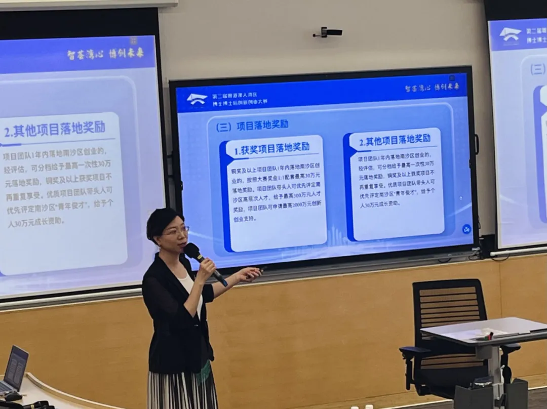 南沙开发区人才发展局副局长赵璇进行了南沙区配套政策解读。她表示,一直以来南沙高度重视博士和博士后这一重要的青年人才群体,对于本次第二届粤港澳大湾区的博士博士后双创大赛,南沙区专门制定了《以赛促引扶持方案》,从参赛加持、落地支持、投融资支持、科创赋能成长支持、博士博士后专项支持和人才服务方面推出了22项专项扶持政策,最大限度的发挥政策支撑作用。