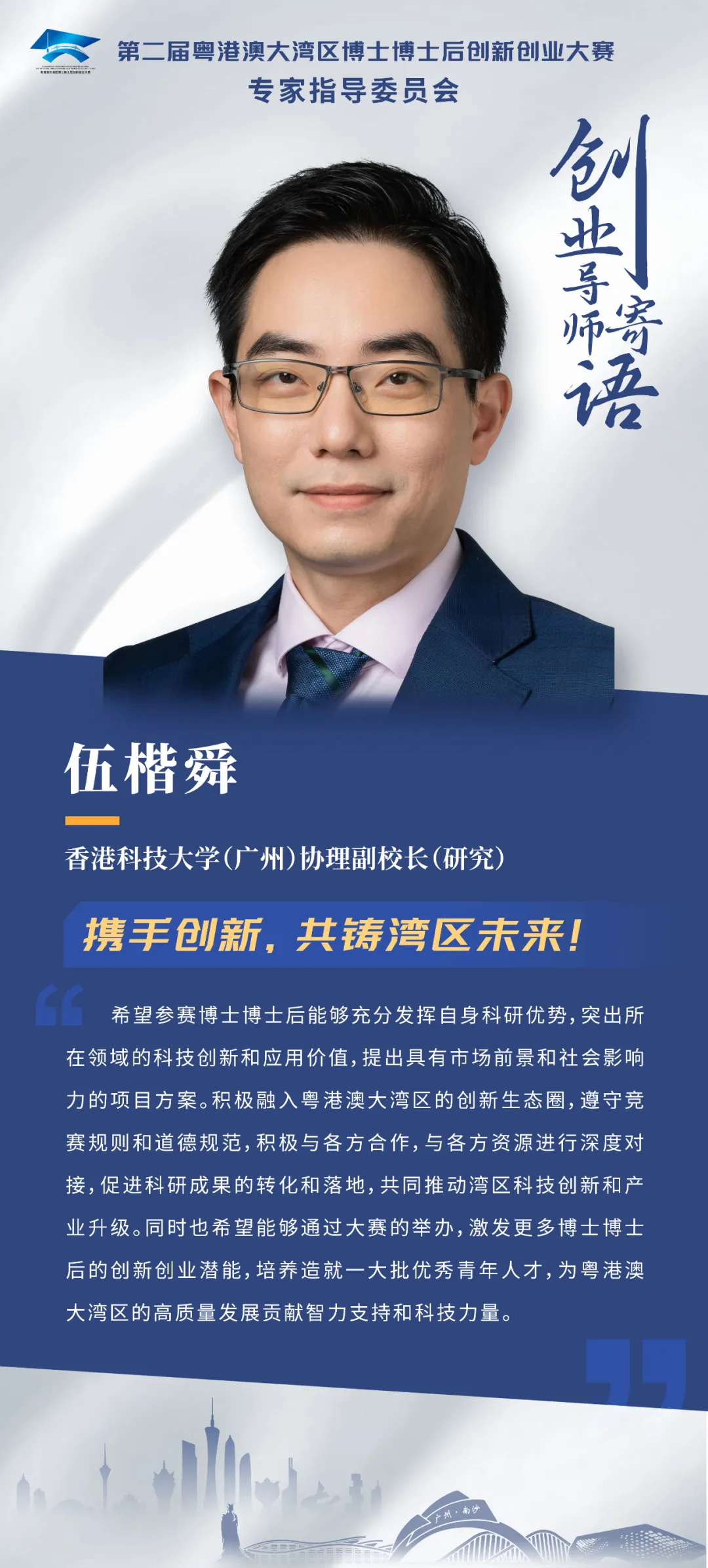 协理副校长(研究)伍楷舜担任大赛的创业导师,并出席大赛推杆启动仪式。他表示,希望参赛博士博士后能够充分发挥自身科研优势,突出所在领域的科技创新和应用价值,提出具有市场前景和社会影响力的项目方案。